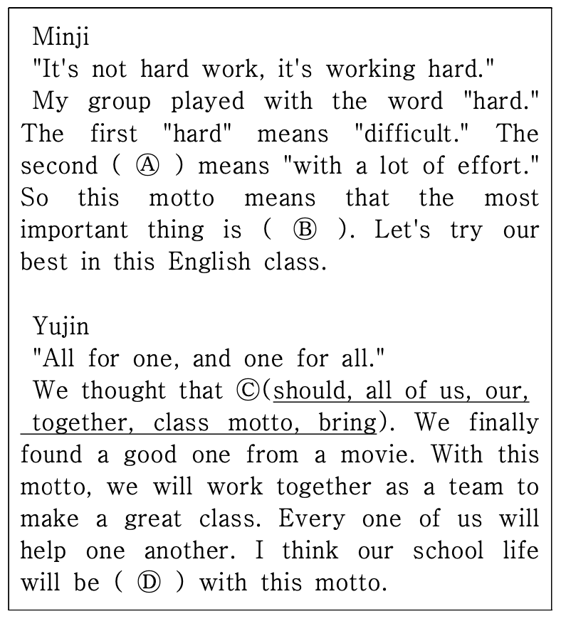 이 지문에서 어떤 주제를 보았나요? 아마 윗부분의 민지에게서는 '노력'을, 아래의 유진이에게서는 '급훈'을 들 수 있겠네요. 최대한 빠르고 기억하기 쉬운 단어를 골라주는 게 좋아요. 문제에서 나올지 안 나올지는 모르지만 혹시 나올 때를 대비해서 기억하려고 하는 것 이니까요.