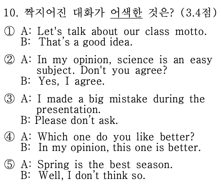 5번에서는 A가 본인의 생각을 말하는데요, 봄이 사계절 중 최고야. 라고 하니 B가 난 그렇게 생각하지 않아. 라며 반박을 하네요.